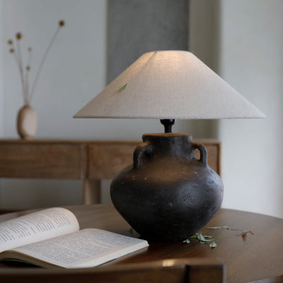 The Clay Pot Table Lamp has a shape like an egg and is a potter's masterpiece and lampshade in one. The pottery lamp body is self-made and old. This linen lampshade gives a soft and quiet vibe and sets the room in a peaceful setting.