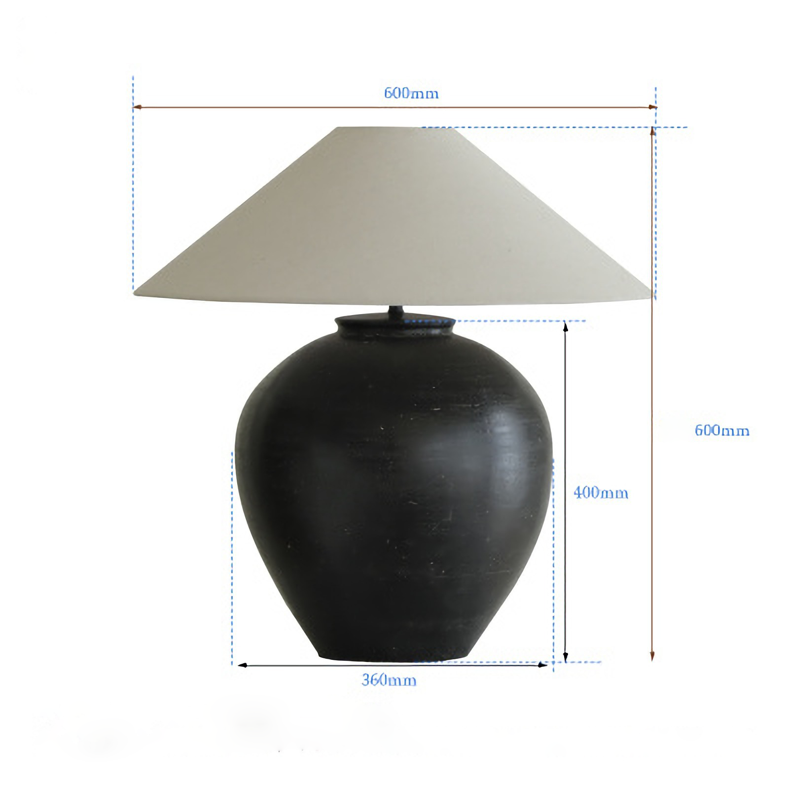This Wabi-sabi style table handmade lamp in body shape is milky white black trumpet in color. The pottery lamp body is self-made and old. This linen lampshade gives a soft and quiet vibe and sets the room in a peaceful setting. The atmosphere created by this lamp is artistic and natural.
