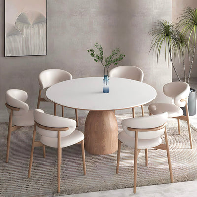 This sophisticated dining set embodies the essence of Italian minimalist design, merging high-end elegance with durable functionality. The centerpiece, an all-solid wood round table, is a testament to timeless craftsmanship.